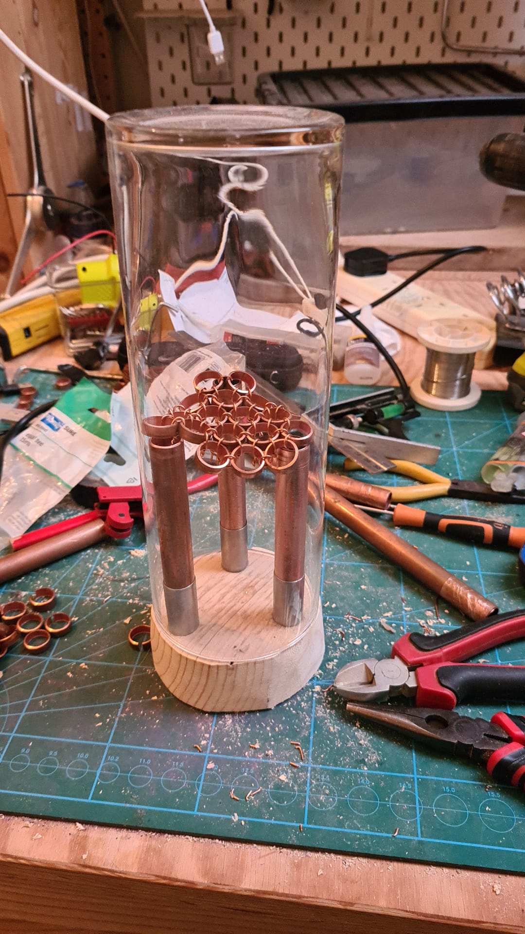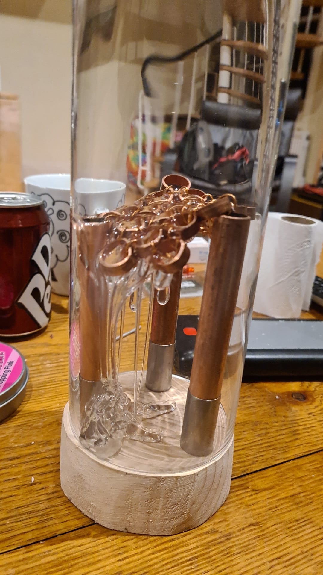 Made from entirely recycled/repurposed materials (apart from the science putty). This includes found copper pipe, earthing cable and bodies from disposable vapes.
