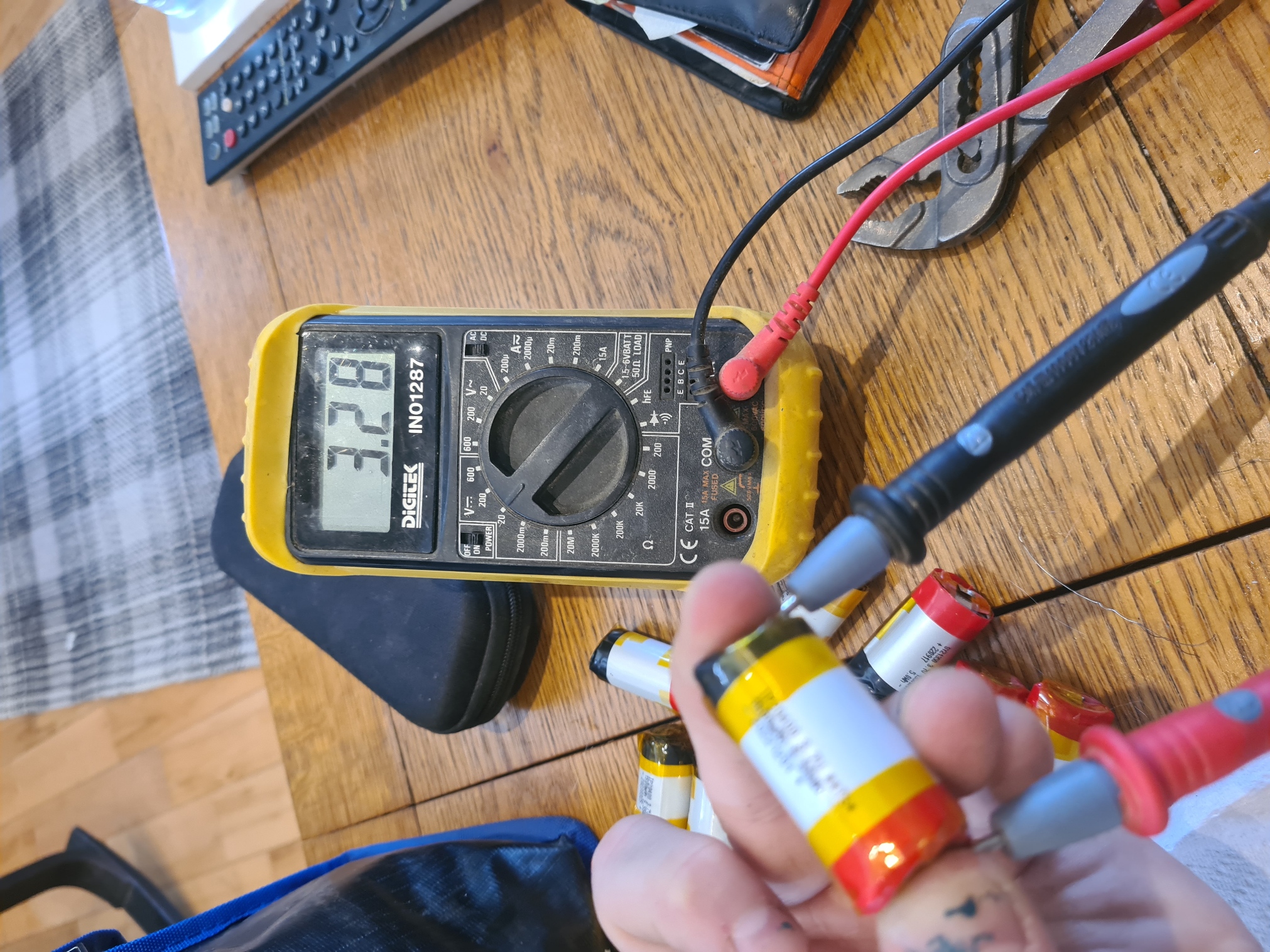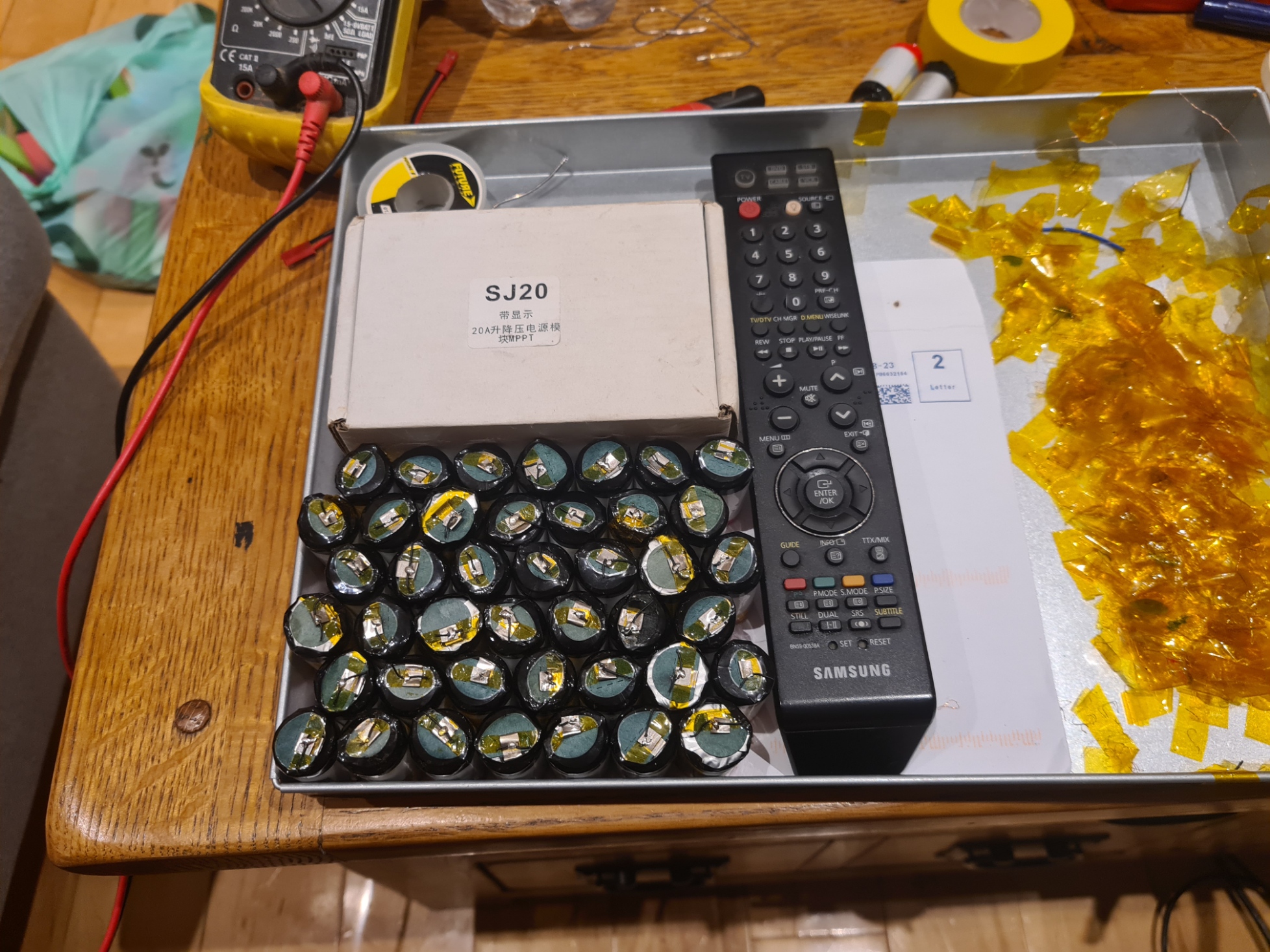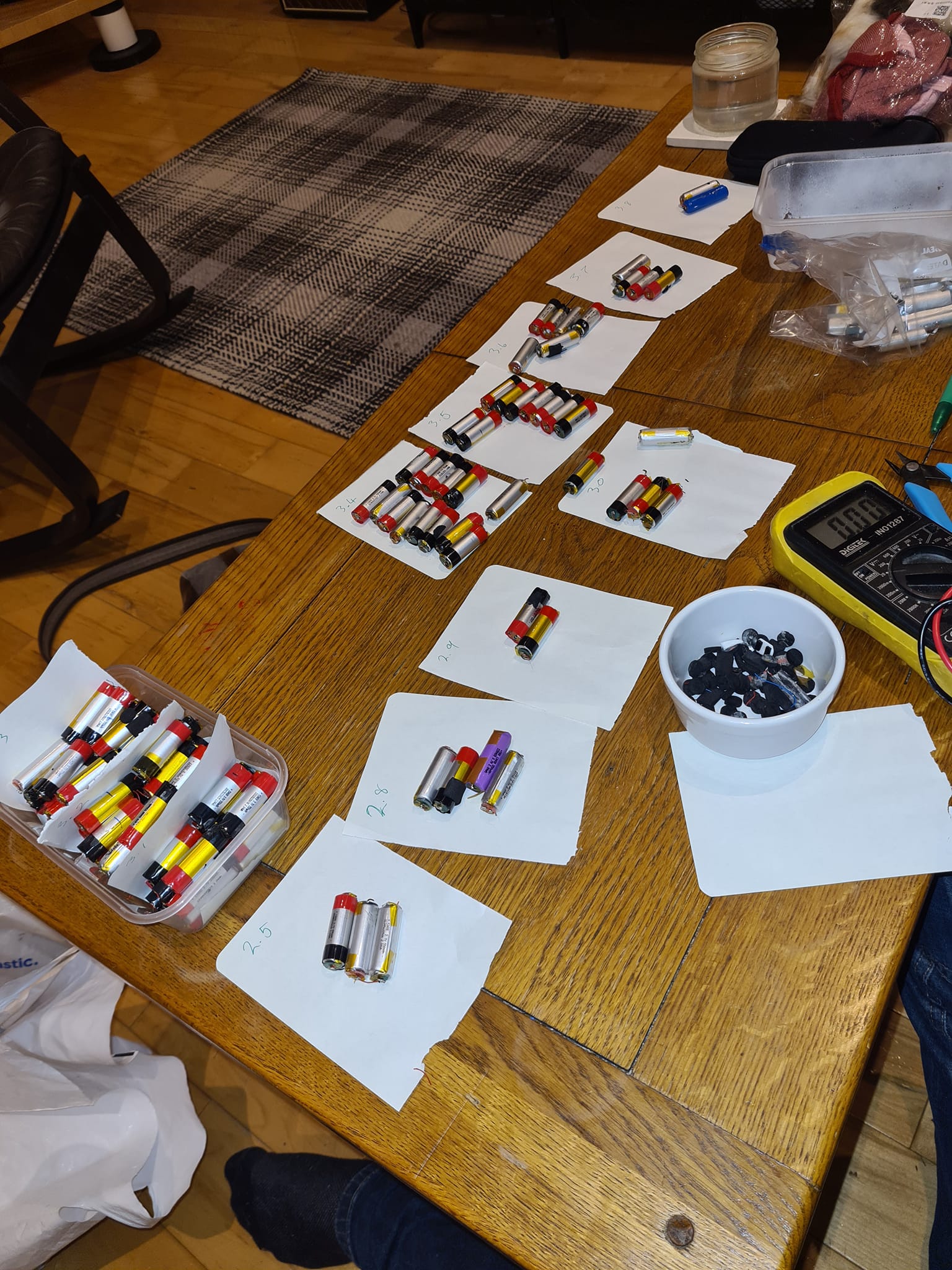 You should have a pile of cells, they need checking to ensure they’re not too discharged and organizing into groups that will be happy with each other. To do this you’ll need your multi-meter and a number of bags or pieces of paper you can pile them on.