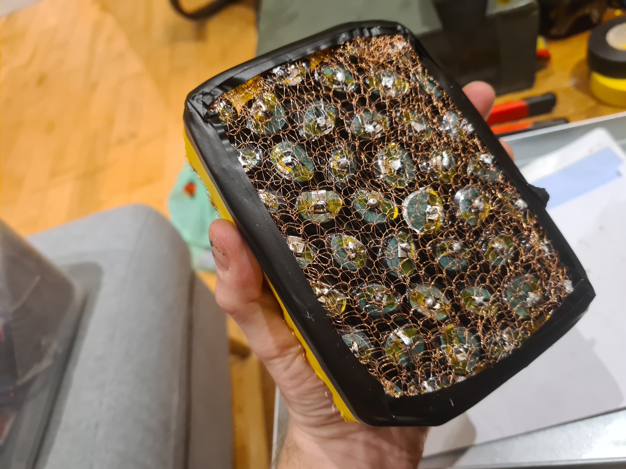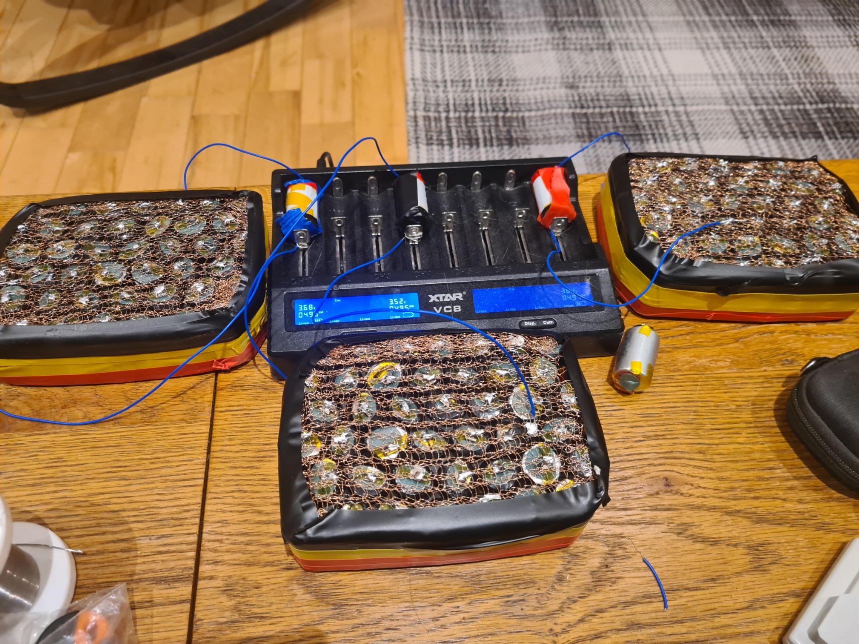 Make sure you don’t short the positive to the negative side of the pack. There’s a decent amount of power here. You won’t get a huge explosion or anything. But you’ll quite easily melt through the copper mesh or thin wires. Also the cells won’t like it.