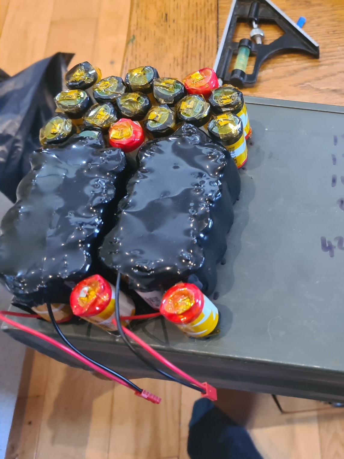 Here in a totally different battery pack you see how I’ve wrapped the packs in black heatshrink. (Ignore the other cells around. I was measuring them up for the case).