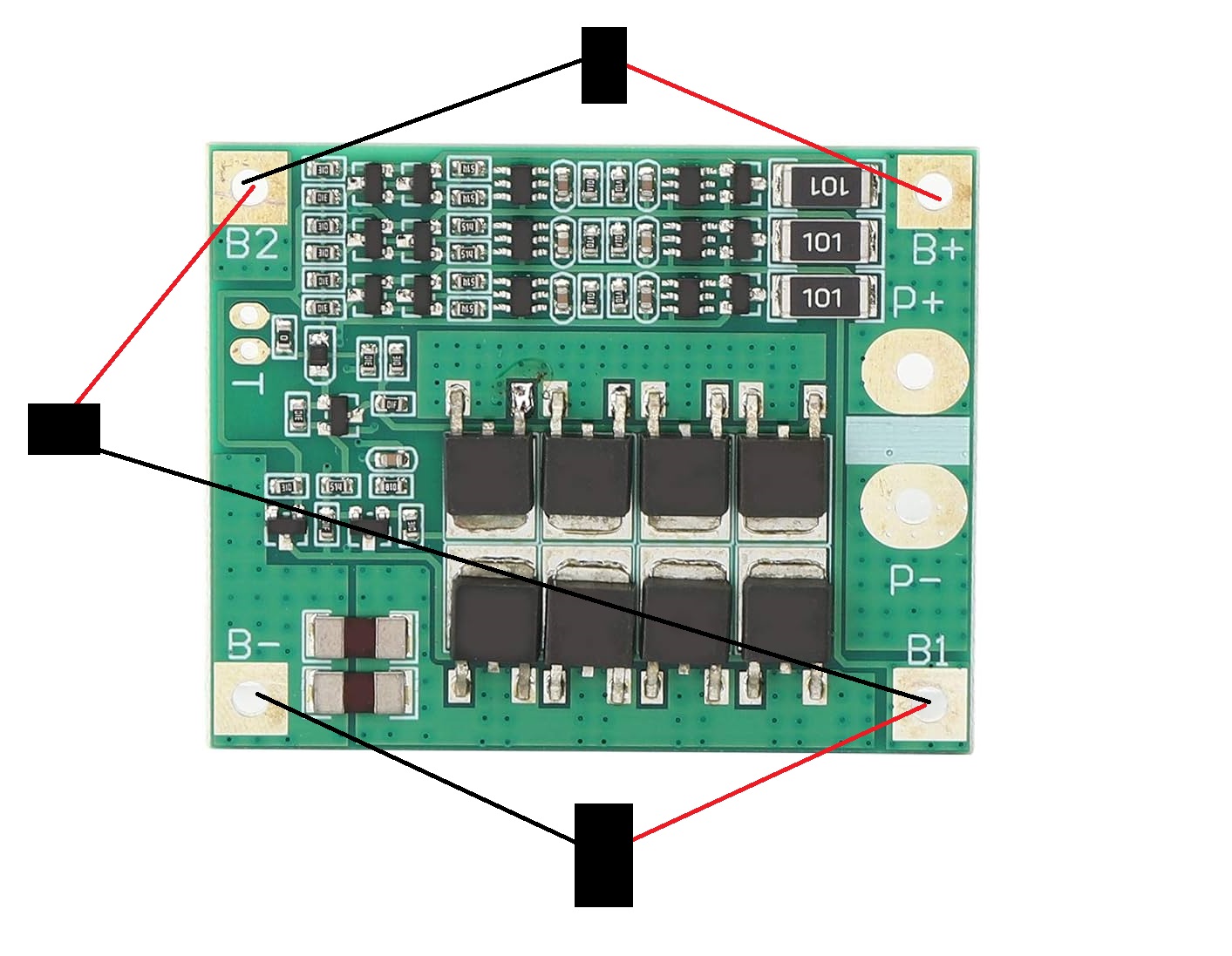Your BMS will look a little like this. The 4 solder pads on the outside are what we’re interested in at the moment. If it doesn’t look exactly like this. Don’t worry. There will be similar markings.